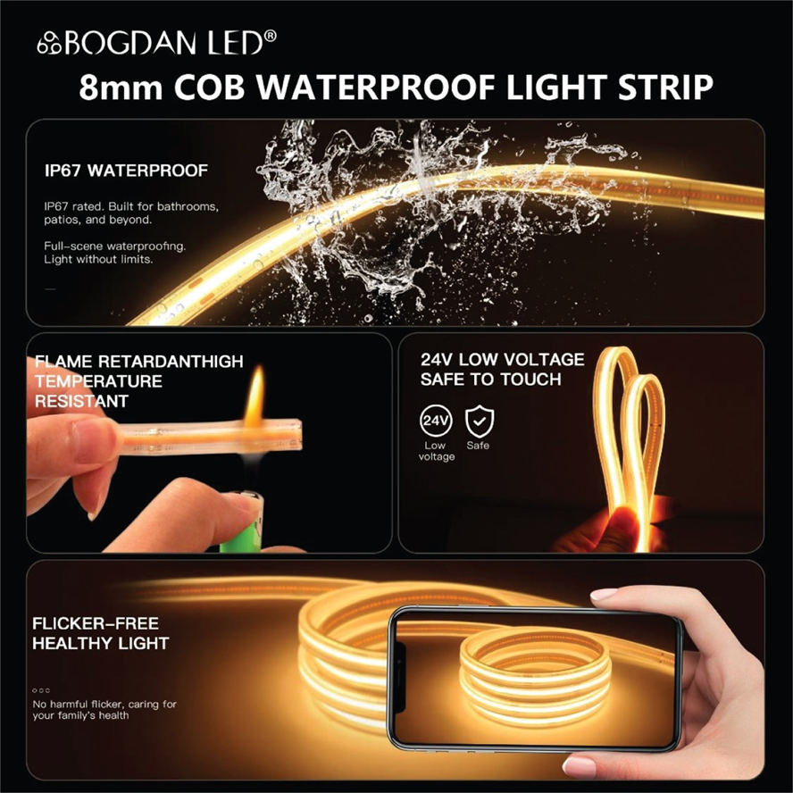 หนึ่งในนวัตกรรมเด่นคือ Smart LED Controller และ 8mm COB Waterproof Light Strip ซึ่งเป็นไฟเส้นแบบไร้รอยต่อ ให้แสงเนียนสม่ำเสมอ สามารถควบคุมผ่านแอปพลิเคชันหรือระบบสั่งงานด้วยเสียง และสามารถกันน้ำมาตรฐาน IP67 เหมาะสำหรับห้องน้ำและภายนอกอาคาร รวมทั้งยังทนความร้อนสูงและหน่วงไฟ (Flame Retardant) ซึ่งใช้แรงดันไฟฟ้าต่ำ 24V ปลอดภัยเมื่อสัมผัส