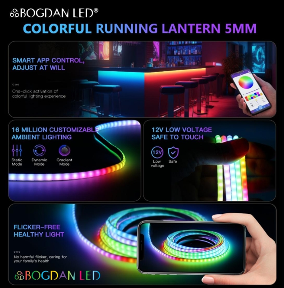 Colorful Running Lantern 5mm ไฟเส้นที่เปลี่ยนสีได้ 16 ล้านเฉดสี รองรับโหมดต่าง ๆ เช่น Static , Dynamic และ Gardient ใช้แรงดันไฟฟ้า 12V ปลอดภัยต่อการใช้งาน และรองรับการใช้งานทั้งในเชิงฟังก์ชันและการสร้างบรรยากาศ เช่น การปรับห้องให้เป็นพื้นที่สังสรรค์หรือคาราโอเกะได้อย่างรวดเร็ว และผลิตภัณฑ์ทั้งสองเป็นรูปแบบ Flicker-Free ไม่กระพริบโดยสิ้นเชิง ซึ่งช่วยลดความล้าของดวงตา ลดอาการปวดหัวจากการใช้แสงไฟนาน และเหมาะอย่างยิ่งสำหรับบ้านที่มีเด็กหรือผู้สูงอายุซึ่งต้องการความใส่ใจเป็นพิเศษ
