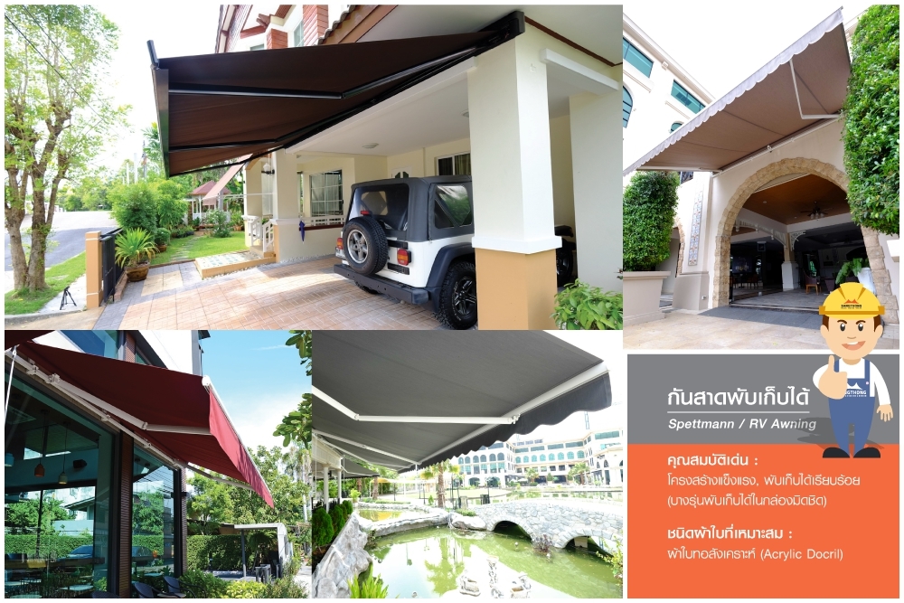 - หากจุดติดตั้งเป็นที่สูง หรือ บริเวณที่ไม่สามารถเดินเข้าถึงได้ ต้องใช้ระบบพับเก็บแบบมอเตอร์ ที่มาพร้อมระบบควบคุมกันสาดด้วยรีโมท