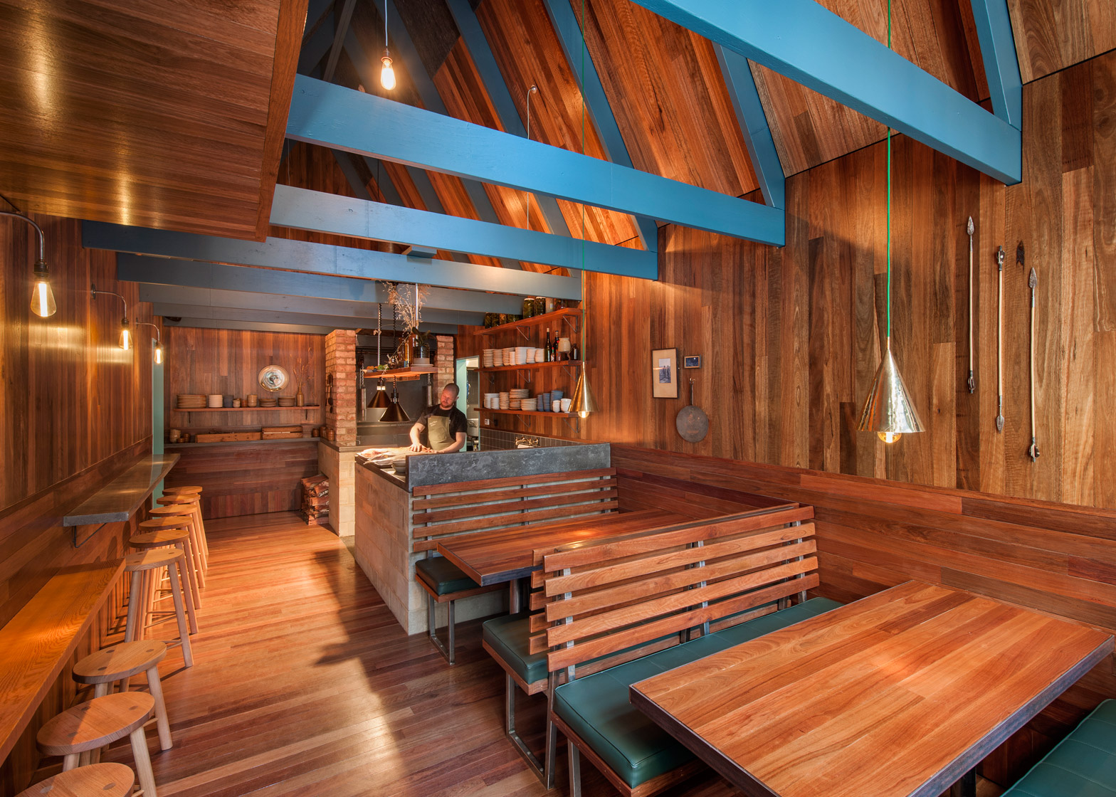 เมื่อเติมเต็มการออกแบบให้สอดคล้องกับคอนเซ็ปต์มากขึ้น จึงได้มีการเลือกใช้ไม้เป็นวัสดุหลักในการก่อสร้าง โดยเลือกใช้วัสดุไม้ท้องถิ่นของประเทศออสเตรเลียทั้งสิ้น เช่นไม้ Spotted gum, ไม้ Tasmanian oak, และไม้ Ironbark พร้อมสร้างความโดดเด่นให้มีสีสันด้วยการทาสีฟ้าบริเวณตัวเสา คานโครงสร้าง รวมไปถึงกรอบหน้าต่าง บานประตู และเบาะนั่งเก้าอี้ยาว ให้ตัวกระท่อมดูโดดเด่นเป็นเอกลักษณ์ตามชนบททั่วไป ให้ความรู้สึกอบอุ่น น่าหลงไหล และเชื้อเชิญแขกให้เข้ามาแวะทานอาหารหรือเครื่องดื่ม