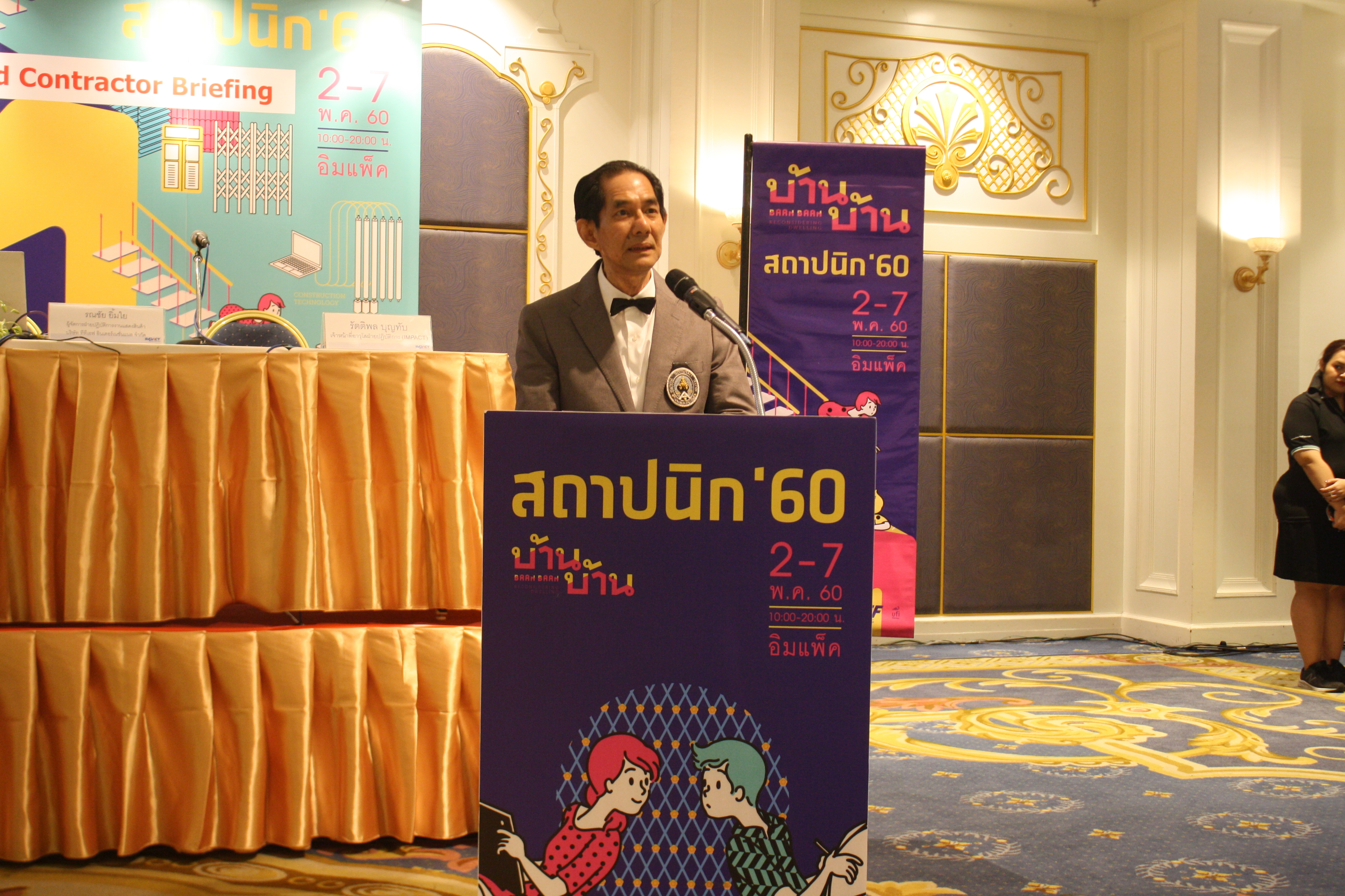 คุณอัชชพล ดุสิตนานนท์ นายกสมาคมสถาปนิกสยามฯ ต้อนรับผู้จัดแสดงสินค้าทุกท่าน และชี้แจงถึงวัตถุประสงค์ของการจัดงานสถาปนิกขึ้นในแต่ละปีพร้อมกับความสำเร็จของงานสถาปนิกที่ผ่านมา