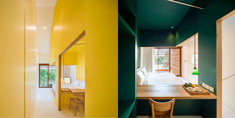• ห้องพักโรงแรม ออกแบบโดยได้แรงบันดาลใจจากการใช้สี 2 สีที่มาจากอาหาร ด้านล่างห้องออกแบบด้วยสี “เขียวชะพลู” ใช้สีเขียวเข้มของใบชะพลูซึ่งเป็นใบไม้ที่เป็นวัตถุดิบของอาหารไทย เช่น เมี่ยง มีรสขมเล็ก ๆ ส่วนห้องด้านบนเป็นสี “เหลืองขนุน” ผลไม้ที่เรามักเห็นเป็นส่วนประกอบของขนมหวานไทย ให้รสชาติหวานสดชื่น