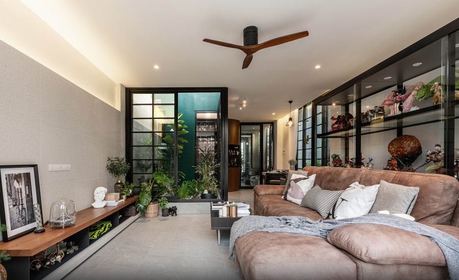 เพราะเจ้าของบ้านเป็นคนชอบลมธรรมชาติและต้นไม้ ชอบท่องเที่ยวและการตกแต่งบ้านด้วยของที่ระลึกที่ซื้อกลับมา และชอบการสะสมโมเดล figure เป็นงานอดิเรก ACa Architects จึงวาง court ไว้ตรงกลางบ้านที่ชั้น 3 บริเวณห้องนั่งเล่น โดยเจาะพื้นชั้น 4 ที่เป็นดาดฟ้าเดิมให้เป็นชิ่งแสงสำหรับสวน สร้าง double space ให้ court กลางบ้าน และเติมช่องแสงผนังอีกด้านให้แสงเข้าได้จากทั้งสองฝั่ง