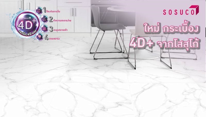 โสสุโก้ โดยบริษัทเอสซีจี เซรามิกส์ จำกัด (มหาชน) ขอแนะนำกระเบื้องใหม่ล่าสุด เพื่อมอบให้เป็นสิ่งที่ดีที่สุดสำหรับวันแม่ด้วยกระเบื้องโสสุโก้ 4D+ (ฟอร์ดีพลัส) ซึ่งได้ถูกพัฒนาเพื่อให้พื้นผิวหน้าของกระเบื้องมีคุณสมบัติพิเศษ 4 ประการ คือ ป้องกันการลื่น แต่เมื่อสัมผัสกลับมีความละมุนสบายเท้า ผิวไม่หยาบเหมือนกระเบื้องกันลื่นทั่วไป ทำความสะอาดง่าย ไม่เก็บฝุ่น เพียงปัดกวาดเช็ดถูตามปกติทั่วไปในชีวิตประจำวัน ไม่จำเป็นต้องใช้น้ำยาพิเศษใด ๆ มีลวดลายสวยสมจริงเหมือนวัสดุธรรมชาติด้วย Random Design ถึง 4 Patterns รังสรรค์ลายริ้วหินอ่อน ลายเส้นแร่ต่าง ๆ ของชั้นหินธรรมชาติแต่ละชนิด มีความโดดเด่น หรูหราเฉพาะตัว สามารถใช้ปูพื้นทุกพื้นที่ภายในบ้านและภายนอกบ้าน เหมาะสำหรับบ้านที่มีผู้สูงอายุและเด็ก รวมทั้งคนรุ่นใหม่ที่ชอบลวดลายโมเดิร์นของหินอ่อนบนพื้นผิวที่ไม่เงามัน