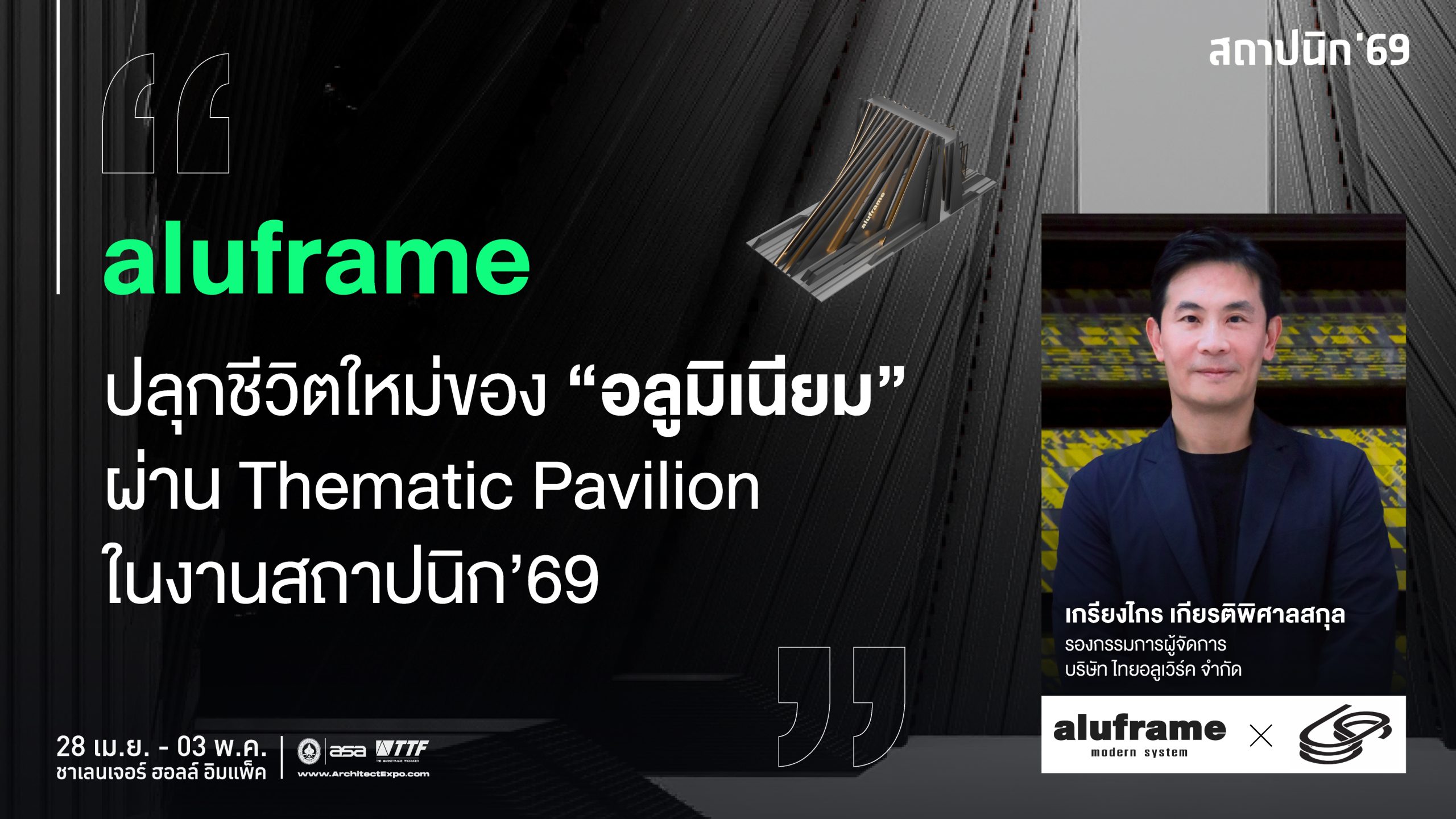 คุณเกรียงไกร เกียรติพิศาลสกุล รองกรรมการผู้จัดการ บริษัท ไทยอลูเวิร์ค จำกัด เผยว่า การนำเสนอในงานสถาปนิกปีนี้ถูกปรับรูปแบบสู่พื้นที่ Thematic Pavilion เพื่อใช้สถาปัตยกรรมเป็นเครื่องมือในการสื่อสารแบรนด์อย่างจริงจัง และเป็นโอกาสสำคัญในการ “ปลุก” บทบาทใหม่ของอลูมิเนียม จากวัสดุที่เคยถูกจำกัดหน้าที่ ให้กลายเป็นองค์ประกอบที่สามารถเล่าเรื่องทางสถาปัตยกรรมได้อย่างเต็มตัว