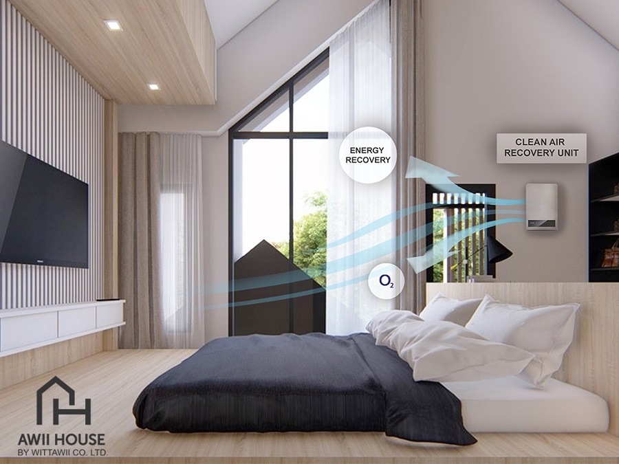 ในส่วนของอากาศภายในที่พักจะมีการติดตั้งนวัตกรรม Clean Air & Energy Recovery เพื่อช่วยลดกลิ่นอับ ไรฝุ่น ควบคุมความชื้นและอุณหภูมิภายในบ้าน มีตัวกรองอากาศแบบพิเศษ พร้อม UVC ฆ่าเชื้อ เพื่อกรองฝุ่นและละอองฝอยขนาดเล็ก อย่าง PM2.5 ไวรัส และแบคทีเรียร้าย ไม่ให้เล็ดลอดเข้ามา