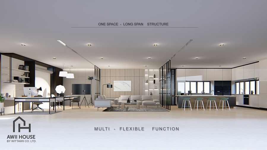 3) Total Working Space รองรับการทำงานและเรียนหนังสือที่บ้าน ทำการออกแบบบ้านให้เป็นแบบ Multi Flexible Function แบ่งพื้นที่การใช้ชีวิตในบ้านได้อย่างยืดหยุ่น ด้วย Long Span Structure โครงสร้างช่วงยาว สร้างพื้นที่เป็นแบบ One Space ไม่มีเสาและผนังกั้น แต่จะเป็นแผงกั้นห้องที่เลือกเปิด-ปิดเฉพาะส่วน เก็บเสียงได้และสามารถเปลี่ยนบ้านเป็นมุมทำงานได้ เช่น กั้นห้อง Conference สำหรับการประชุม ห้องไลฟ์สด สำหรับขายของออนไลน์ ห้อง Streaming สำหรับ Caster Blogger และ Youtuber เป็นต้น