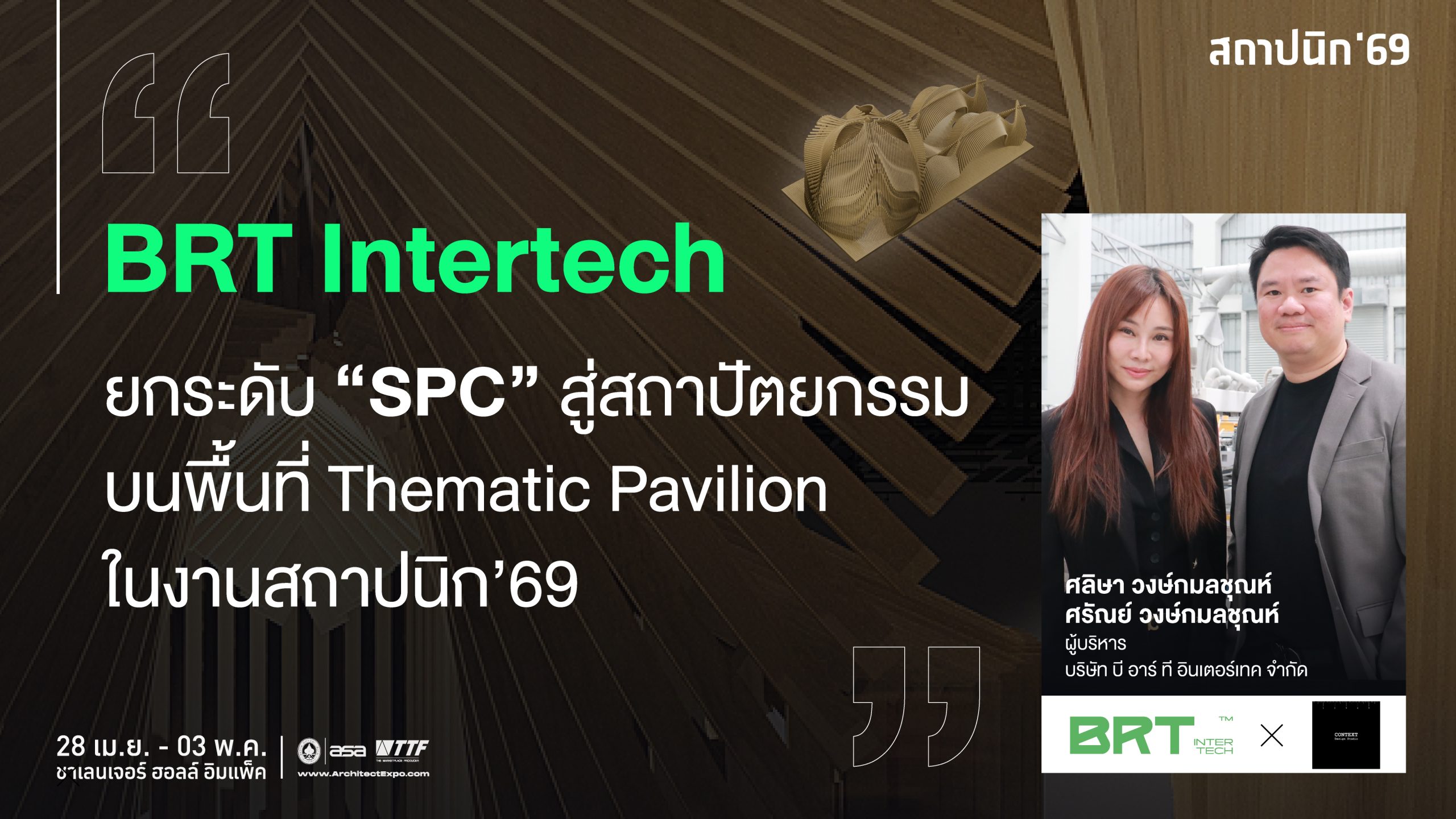 การเข้าร่วม Thematic Pavilion ในปีนี้ คือสิ่งที่ทาง BRT Intertech ตั้งใจใช้เป็นก้าวสำคัญในการขยับบทบาทของวัสดุ จากการเป็นสินค้า ไปสู่การแสดงศักยภาพในระดับสถาปัตยกรรมจริง ที่ผู้ชมสามารถเดินผ่าน สัมผัส และรับรู้ได้ด้วยตัวเอง