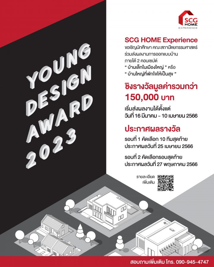 SCG HOME Experience ร้าน Flagship Store ของ SCG HOME ที่เน้นสินค้านวัตกรรมเพื่อที่อยู่อาศัย ขอเชิญนิสิต นักศึกษา คณะสถาปัตยกรรมศาสตร์ ชั้นปี 3-4 จากมหาวิทยาลัยทั่วประเทศ ร่วมส่งผลงานประกวดออกแบบบ้าน ในงาน “SCG HOME Experience Young Designer Award 2023” ระหว่างวันที่ 16 มีนาคม – 27 พฤษภาคม 2566 เพื่อเปิดโอกาสให้คนรุ่นใหม่ได้โชว์ศักยภาพผ่านผลงานการออกแบบบ้าน แบบดี่ยว หรือกลุ่มละไม่เกิน 3 คน ภายใต้โจทย์และเงื่อนไขที่กำหนด เพื่อชิงเงินรางวัลเงินสด 50,000 บาท พร้อมใบประกาศนียบัตร นอกจากนี้ผลงานที่เข้ารอบยังถูกคัดเลือกพัฒนาเป็นแบบบ้านมาตรฐาน เพื่อใช้ก่อสร้างจริง สำหรับลูกค้าที่สนใจอีกด้วย