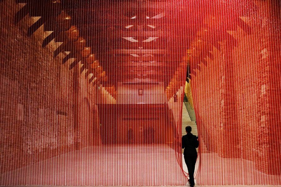 หญิงคนหนึ่งกำลังเปิดม่านลูกปัดสีแดงขนาดใหญ่ เพื่อเข้าไปสู่งานแสดงศิลปะและสถาปัตยกรรมในแกลเลอรี่ของ Tadao Ando ซึ่งเป็นงานแสดงศิลปะเกี่ยวกับ HIV