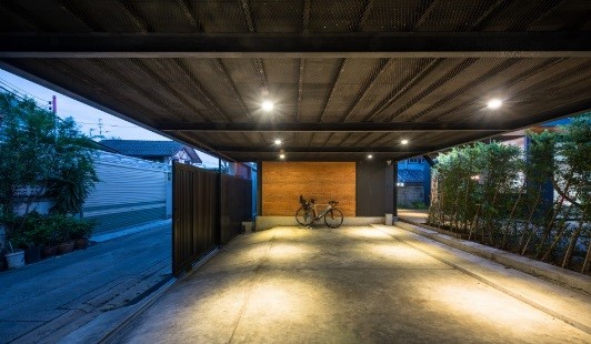 อีกตัวอย่างของการใช้เหล็กรูปพรรณรีดร้อนที่น่าสนใจและคุ้มค่าอีกจุดของบ้านหลังนี้ คือการใช้เหล็กรูปพรรณรีดร้อนในการพาดโครงสร้างช่วงกว้าง เนื่องจากบ้านหลังนี้ใช้พื้นที่จอดรถซึ่งมีความกว้างถึง 9 เมตร โดยไม่มีเสาขั้นกลางเพื่อความสะดวกในการจอดรถ จากการปูหลังคาด้วยวัสดุที่มีน้ำหนักเบาอย่างแผ่นซีเมนต์บอร์ดก็สามารถออกแบบโครงสร้างให้มีขนาดเล็กลงได้มากขึ้น ดูเบาลอย และสร้างความสะดวกต่อการจอดรถเป็นอย่างมาก เมื่อเทียบกับโครงสร้างคอนกรีตเสริมเหล็ก การทำช่วงพาดได้ยาวขนาดนี้ ตัวโครงสรางจะต้องมีหน้าคานที่หนาประมาณ 70 – 80 เซนติเมตร จึงจะมีความแข็งแรง แต่หากเป็นโครงสร้างเหล็กรูปพรรณรีดร้อนก็สามารถใช้ความหนาโครงสร้างที่ประมาณ 25 – 30 เซนติเมตร เท่านั้น